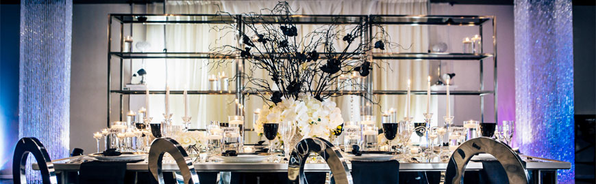 DORSIA Collection: A glamorous, art deco inspired event rental collection featuring silver and gold mixed metal chairs, community tables, cocktail tables, bar stools, bar backs and more!