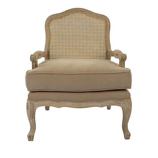 Pauline Bergere Chair – French Bergere style chair with ivory linen upholstery and rattan cane back.