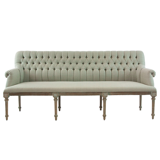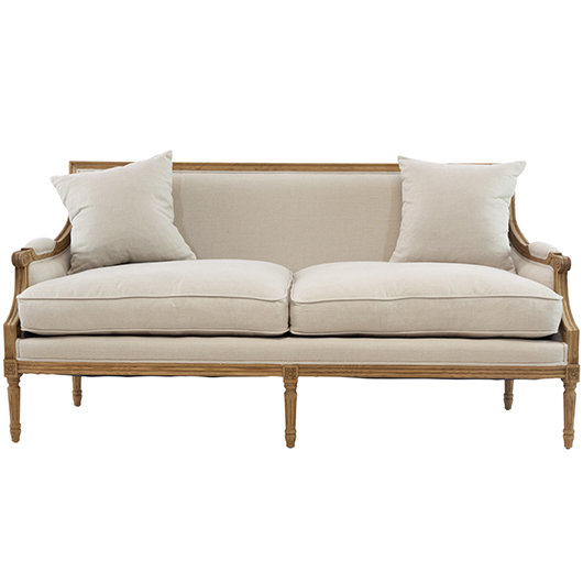 Capelette Sofa- Louis the 16th, French farmhouse style exposed frame couch in grey linen with double cushion seat.