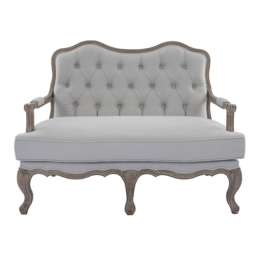 Claire Loveseat Sofa – French farmhouse style couch love seat with ivory linen fabric, high tufted back and turned oak legs.