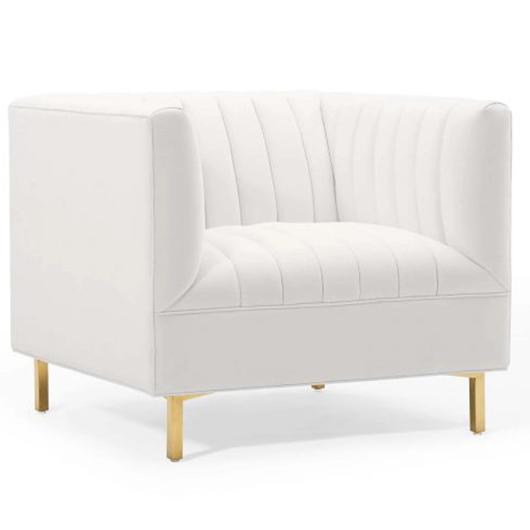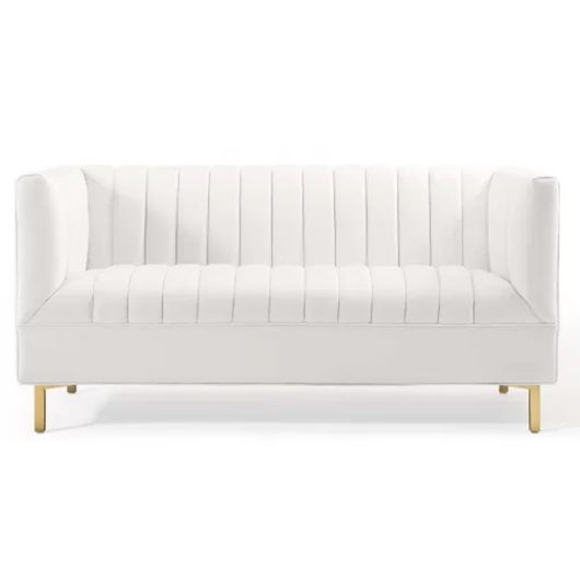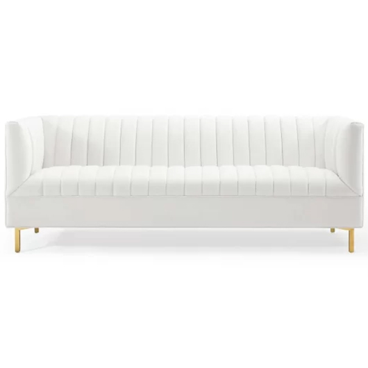 The Gray Delano Sofa has a modern look with velvet upholstery and vertical channel tufting on the seat and back of the couch with gold legs.