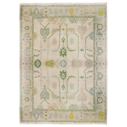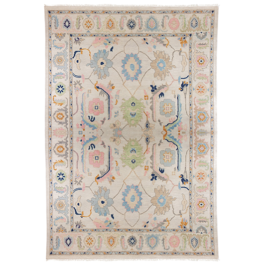100% wool, hand-knotted Turkish Rug with pink background and multi color oushak pattern.