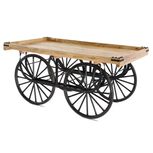 The Bastille Display Cart has a rustic wood tray top, additional shelf and black wagon spoke wheels.